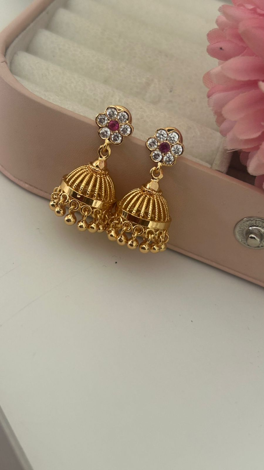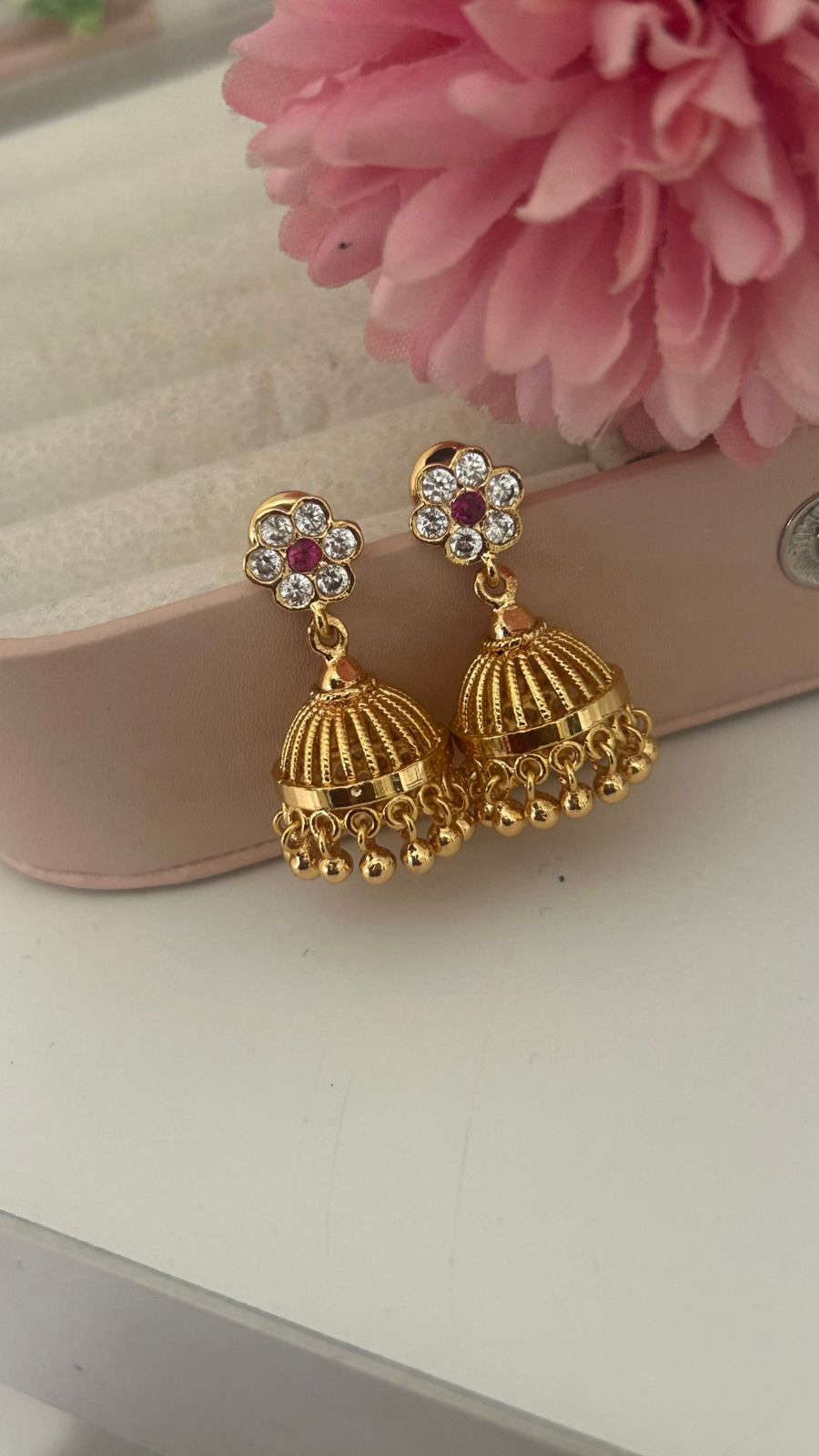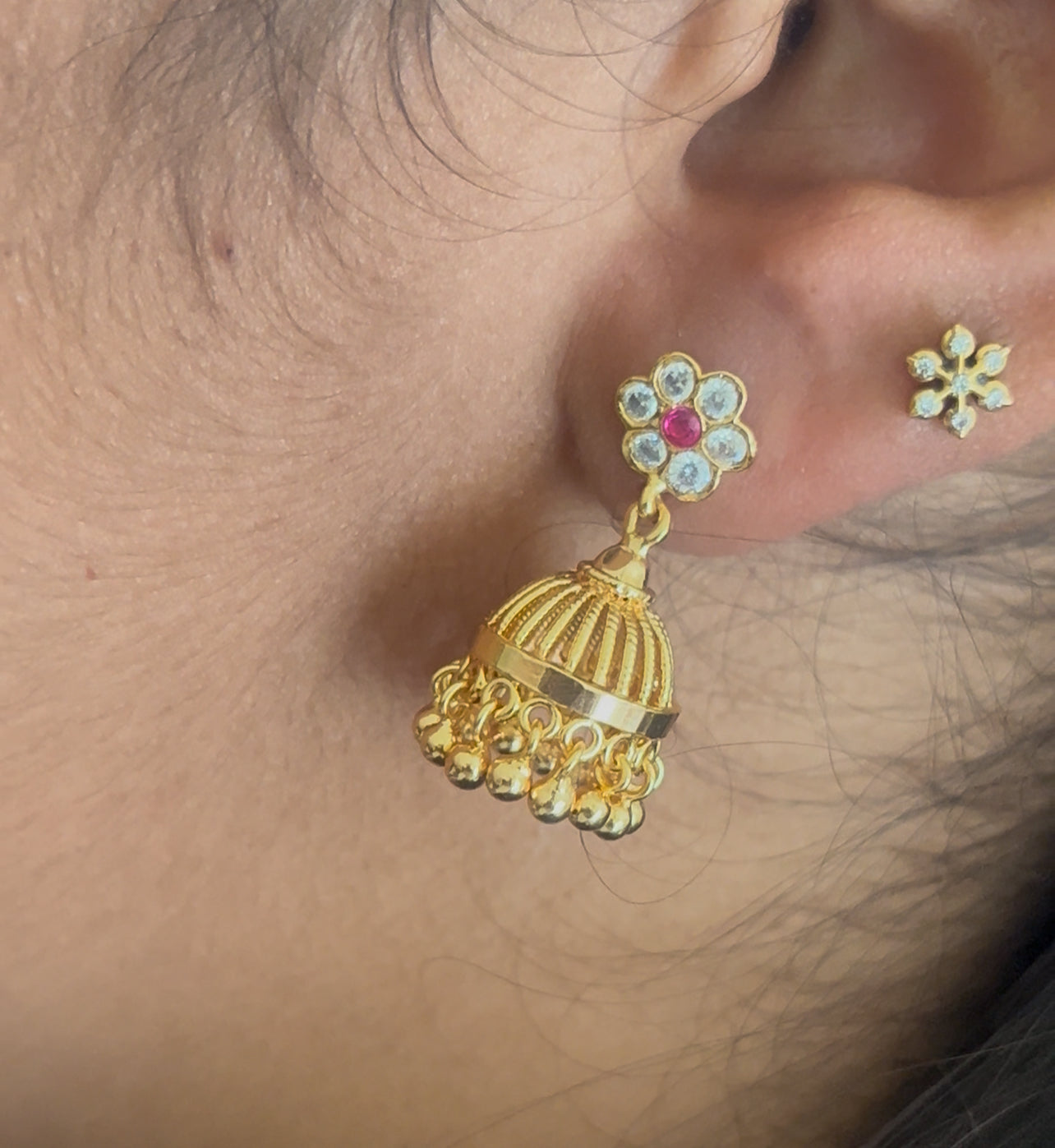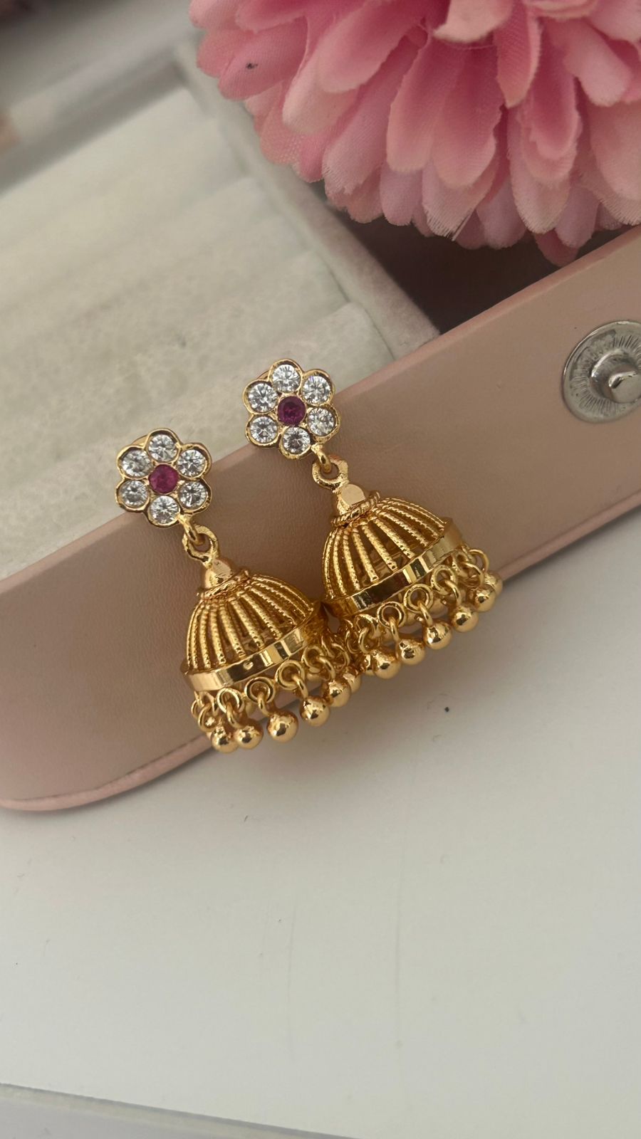 These Gold-Plated Floral Stone Jhumka Earrings feature a charming flower-shaped stud adorned with sparkling white stones and a central ruby accent. The traditional bell-shaped jhumka design is detailed with intricate grooves and tiny dangling beads, adding a graceful ethnic touch. Perfect for festive occasions, traditional outfits, or elegant everyday wear.