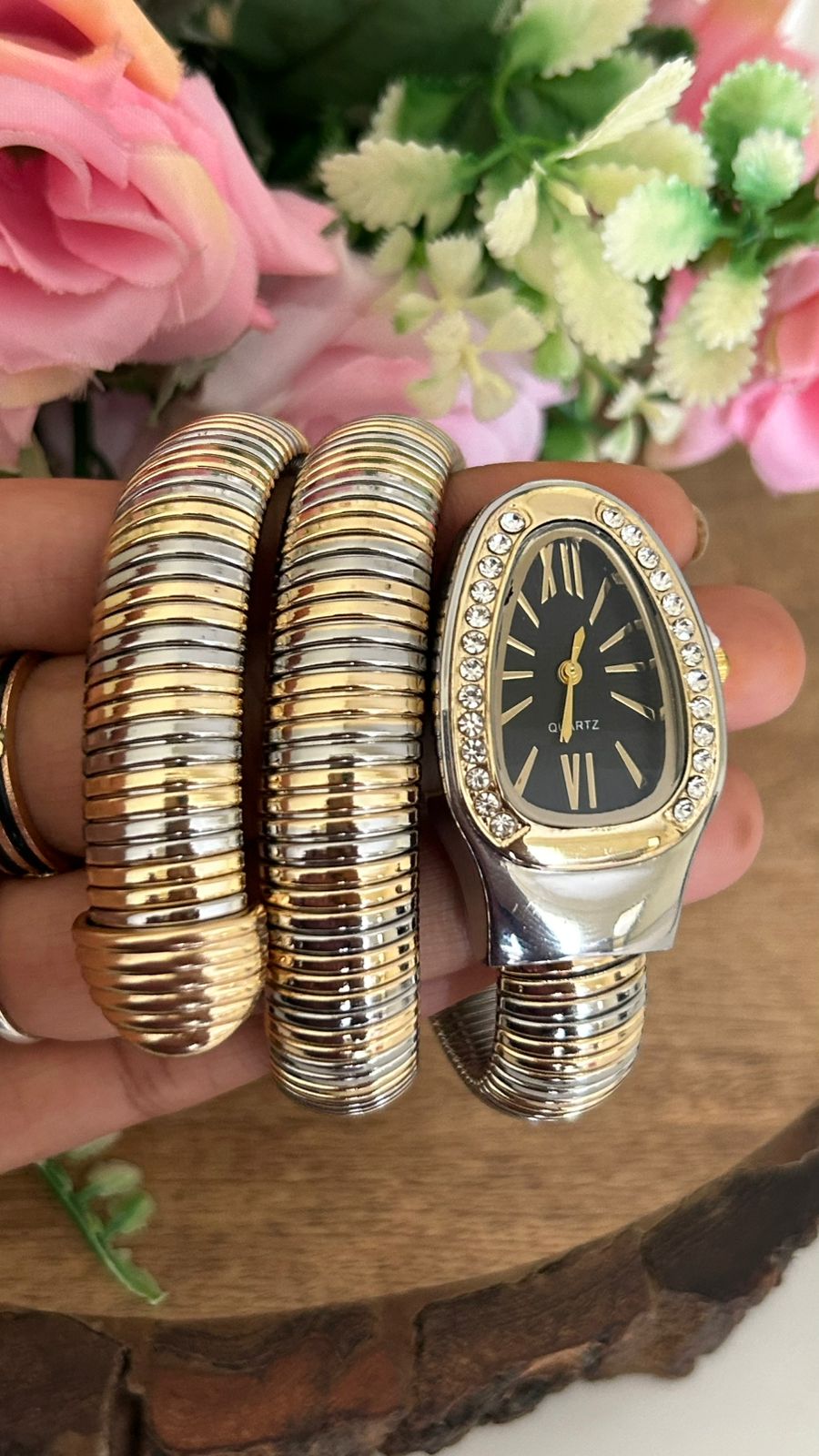 Women's Snake Wrap Watch, Gold and Silver Tone, Crystal Embellished Bezel, Black Dial for Women & Girls